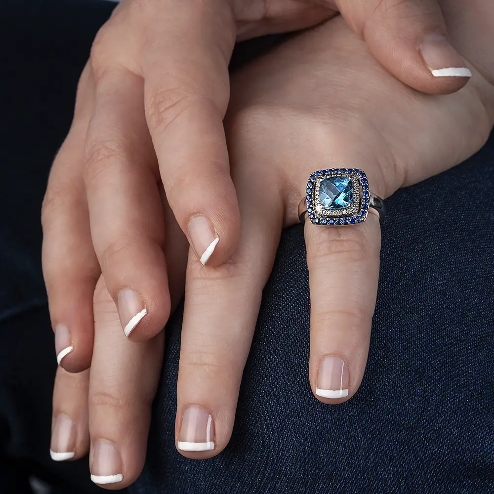 For the woman who lights up a room with her laughter, this 14k white gold ring features an 8 x 8 mm Levian blue topaz in the center of an array of diamonds and sapphires. The stones are surrounded by 28 diamonds and 28 dark blue sapphires. This ring is perfect for dressing up your weekend look or for dressing up your work wardrobe.