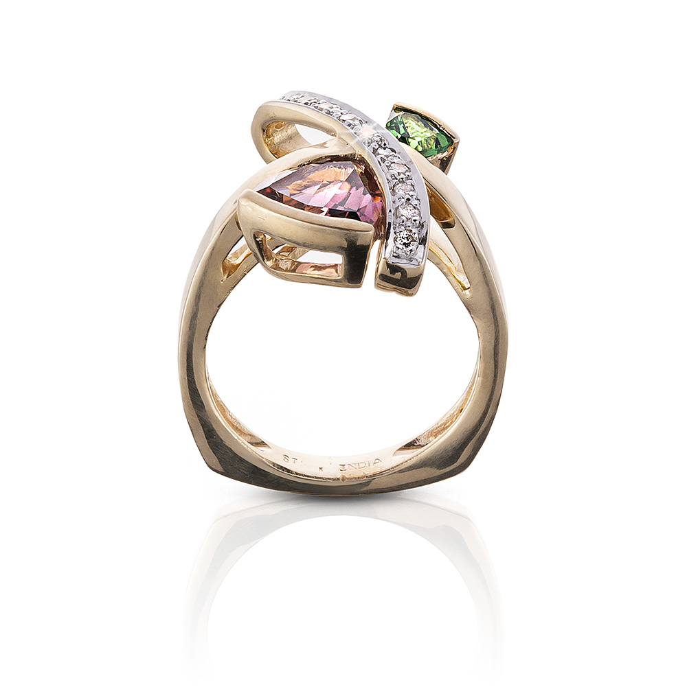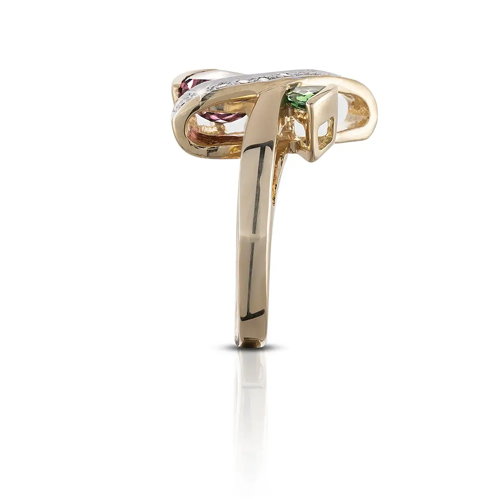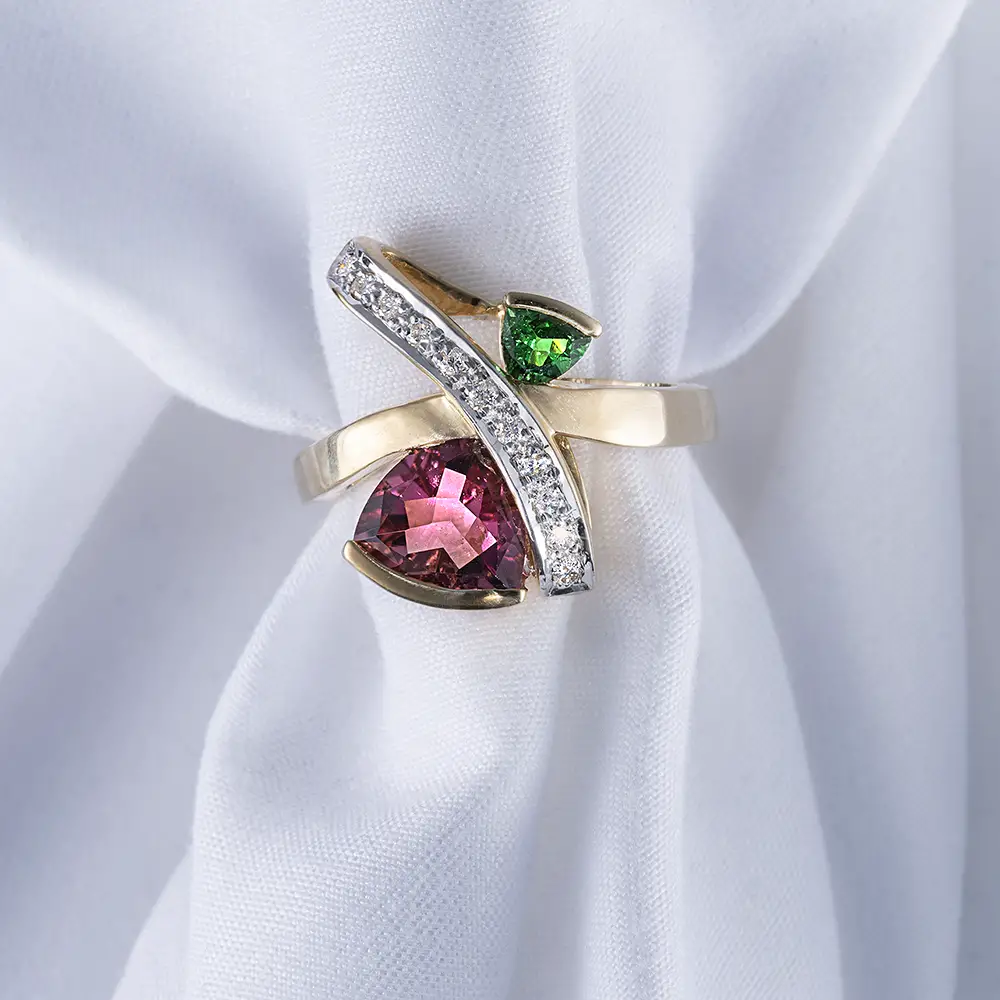 14K Yellow Gold Pink Tourmaline, Tsavorite Garnet and Diamond Ring – FR-YG-00028